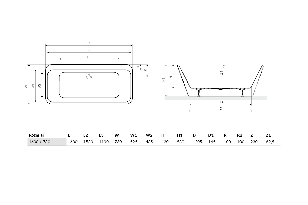 Posiada wbudowny przelew, syfon z korkiem click-clack, w komplecie ze stelażem i nóżkami.