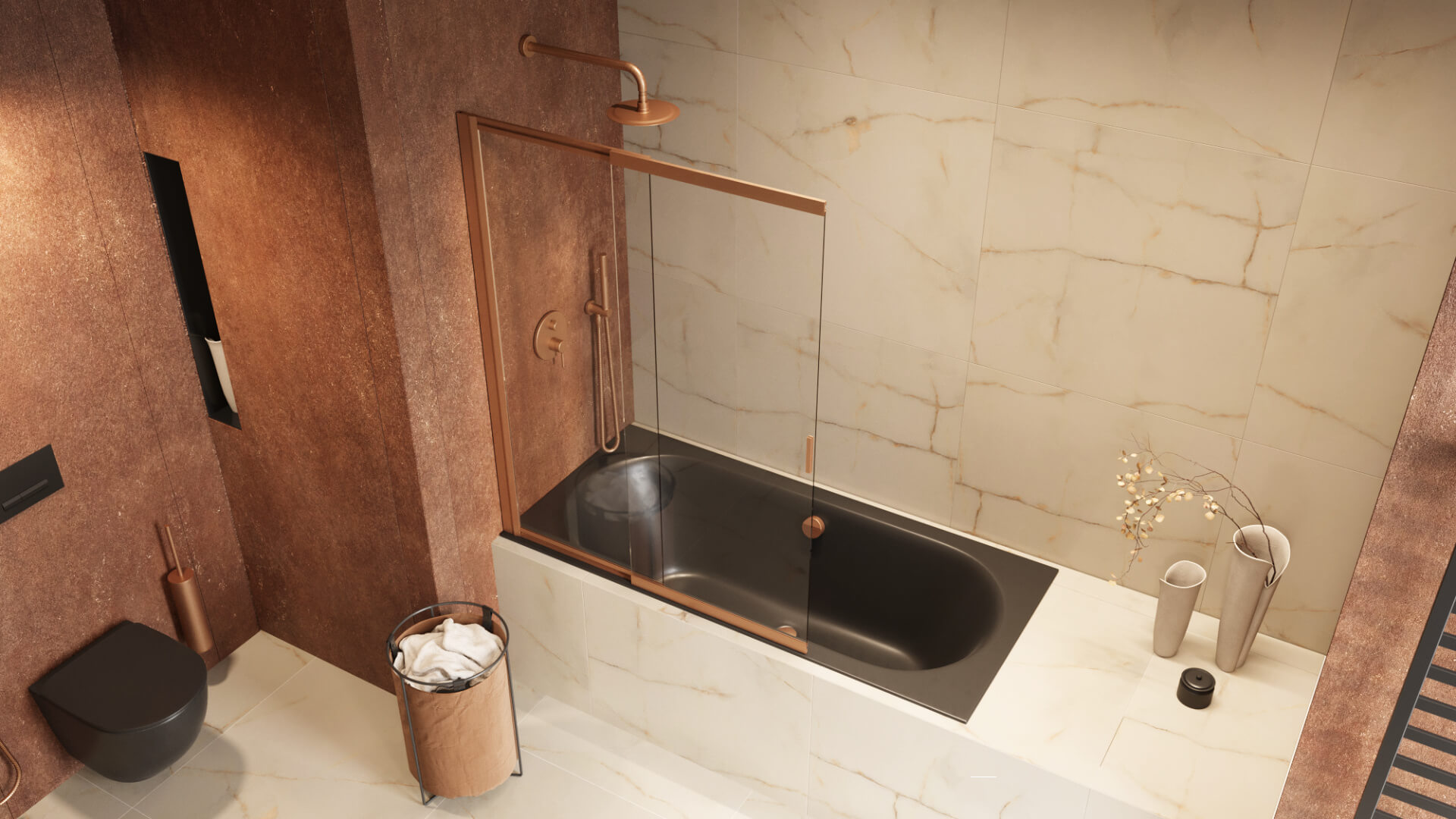 Parawan został wykonany z przezroczystego szkła hartowanego o grubości 6mm. Na szkło naniesiono nanopowłokę Clean Control, która ułatwia czyszczenie. Wyposażono go w unoszony zawias z zakresem ruchu 180°, który sprawia , że składanie i rozkładanie parawanu jest jeszcze bardziej wygodne. Dzięki temu, parawan można swobodnie złożyć do ściany. Montaż parawanu jest uniwersalny - w zależności od potrzeb: lewy lub prawy. Parawan dostępny jest w pięciu wersjach kolorystycznych - srebrny połysk, czarny mat, złoty połysk oraz modne wersje szczotkowane: złoty i miedziany.