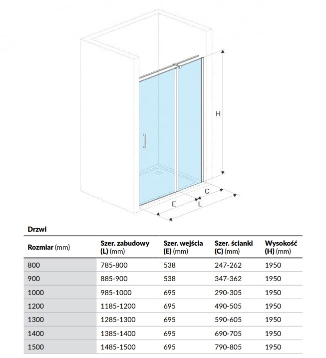 Drzwi wnękowe pojedyncze ze ścianką stałą posiadają pojedyncze drzwi wahadłowe, dostępne są wymiarach 800, 900, 1000, 1200, 1300, 1400, 1500. Kabina ma wysokość 1950 mm.