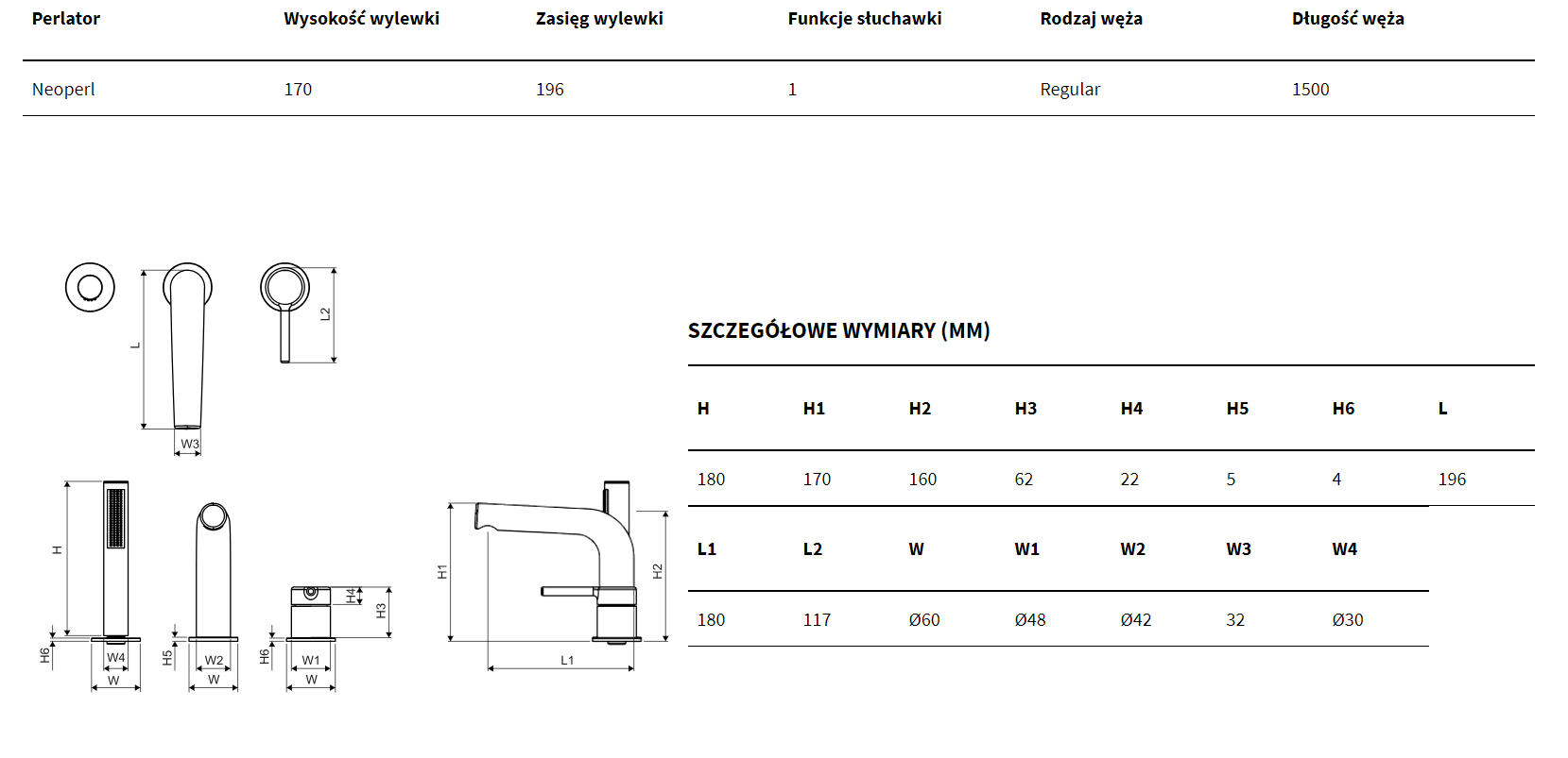 Bateria pozwala na montaż na rancie wanny lub na płytkach (o grubości do 40mm). Wykonana z mosiądzu, posiada głowicę ceramiczną Kerox oraz mechaniczny przełącznik. Może być instalowana na rancie o szerokości min. 80 mm i długości 370-420mm. Wylewka o wysokości 170 mm ma zasięg 196mm.