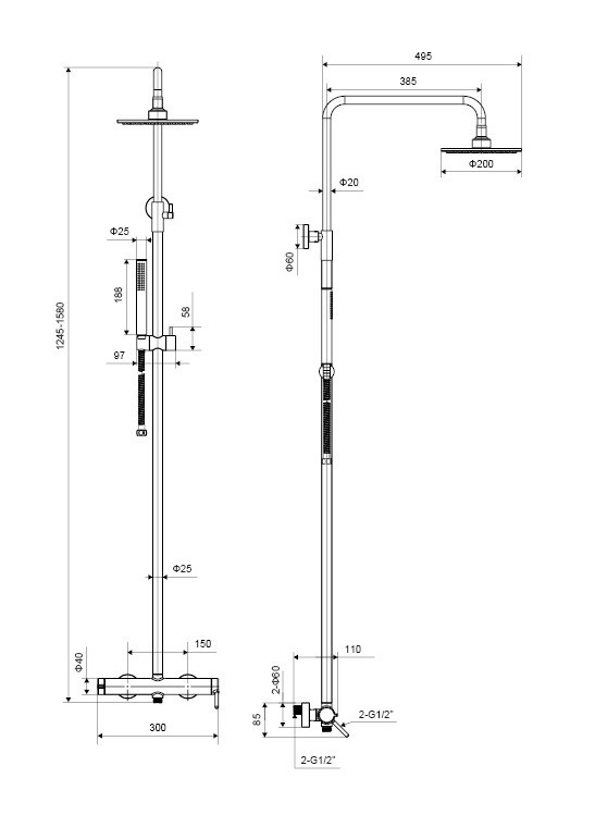 Zestaw prysznicowy PI daje duże możliwości dopasowania – ponad 60 cm regulacji wysokości drążka. Posiada mechaniczny przełącznik funkcji w postaci pokrętła z lewej strony baterii, uchwyt baterii pozwala na swobodną regulację ciśnienia i temperatury. Bateria posiada wbudowaną głowicę Kerox. Bateria połączona jest z pionową rurą zestawu o długości 91-153 cm oraz wysięgiem 38 cm. Górna głowica o średnicy 20 cm, oraz 1-funkcyjna słuchawka pozwalają na komfortowe użytkowanie zgodnie z potrzebami.