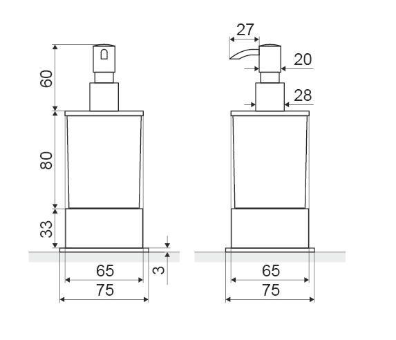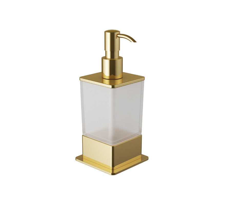 Dozownik do mydła w płynie stojący RIKO składa się z metalowej podstawki oraz pojemnika wykonanego ze szkla mrożonego wyposażonego w pompkę umożliwiającą dozowanie mydła w płynie. Metalowa podstawka wyposażona jest w plastikową obręcz zabezpieczającą szklany element przed uszkodzeniem. Podstawka posiada specjalne naklejki chroniąca powierzchnię przed zarysowaniem.