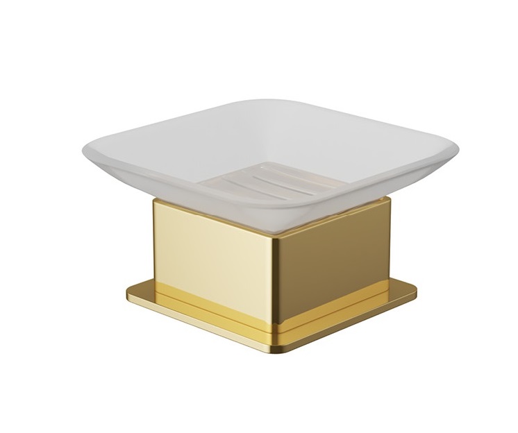 Ten nowocześnie zaprojektowany produkt łączy w sobie modernistyczne wzornictwo i praktyczne zastosowanie. Połączenie dwóch elementów – estetycznej miseczki z mrożonego szkła i podstawki wykonanego z mosiądzu w wykończeniu złotym wykonanym w technologii PVD. Daje to wyjątkowy efekt wizualny przy równoczesnym zachowaniu pełnej funkcjonalności. Mydelniczkę łatwo wyczyścić i tym samym zachować najwyższy poziom higieny w łazience, zaś podstawka z mosiądzu wyposażona jest w plastikową nakładkę, która chroni szklaną miseczkę przed pęknięciami. Nie musisz też bać się o zarysowania na umywalce bądź szafce – spód podstawki zabezpieczony jest specjalnymi naklejkami.