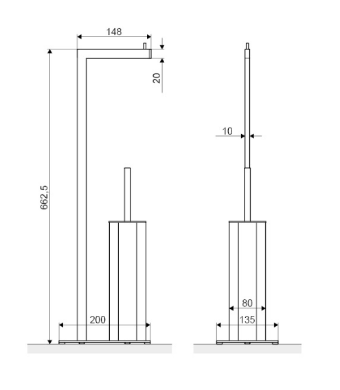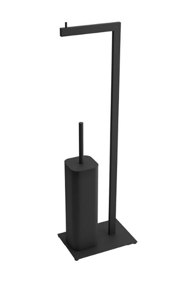 Stojak na papier toaletowy ze szczotką składa się z metalowego pojemnika w wykończeniu czarny mat, szczotki w kolorze czarnym z uchwytem oraz uchwytu na papier toaletowy.