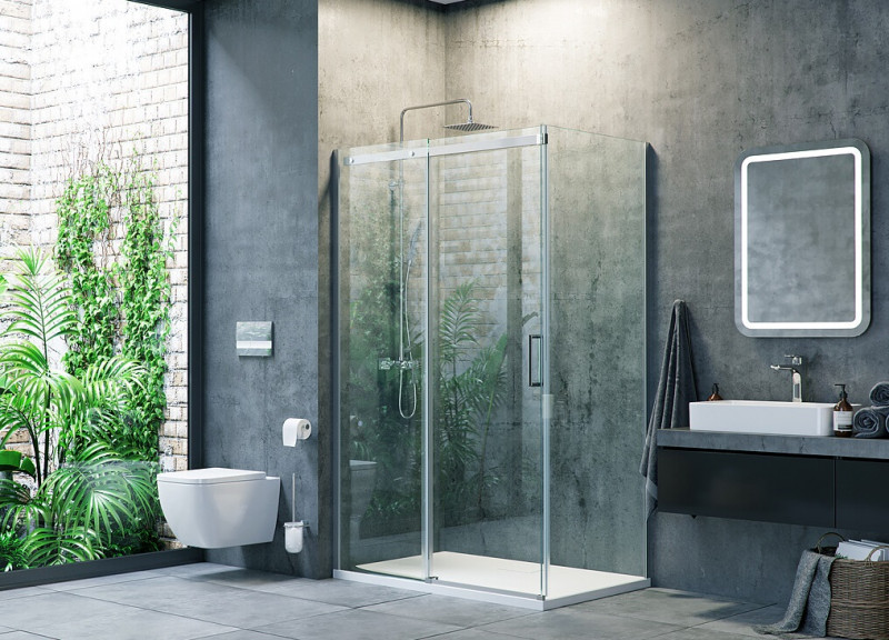 Kabiny narożne z drzwiami przesuwnymi posiadają szkło hartowane o grubości 8 mm, pokryte dwustronnie nanopowłoką Clean Control, która ułatwia utrzymanie czystości powierzchni zarówno od wewnątrz, jak i na zewnątrz. Wygodę czyszczenia ułatwiają także płaskie mocowania przy drzwiach. Wysokie, wypinane drzwi o wysokości 200 cm, z magnesami ukrytymi w przezroczystych uszczelkach Ultra Clear zapewniają pełną szczelność dzięki dokładnemu dociąganiu drzwi. Zintegrowany próg uszczelniający oraz magnes nie pozwalają wydostać się wodzie poza kabinę. Eleganckie uchwyty ze stali nierdzewnej doskonale komponują się w każdej łazience. Zamontowane w kabinach niezawodne systemy jezdne, zostały przetestowane na 30 000 cykli otwarcia i zamknięcia.