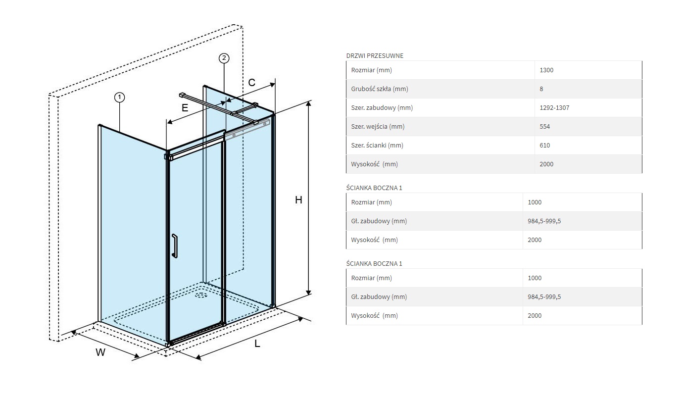 Kabina przyścienna posiada pojedyncze drzwi przesuwne, dostępna jest w trzech rozmiarach drzwi (1200, 1300, 1400 mm) oraz ścianek bocznych (800, 900, 1000 mm). Kabina ma wysokość 2000 mm.