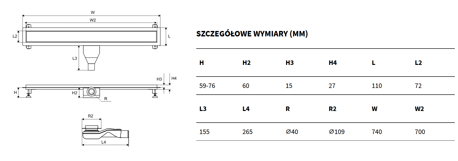 Odpływ Stilio dostępny jest w czterech rozmiarach: 600, 700 mm, 800 mm i 900 mm.