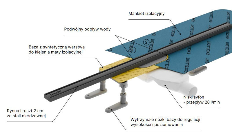 Smukła forma i szeroka gama wykończeń sprawiają, że doskonale wpisuje się w estetykę nowoczesnych łazienek, niezależnie od stylu wnętrza. Zaawansowany, podwójny system odprowadzania wody skutecznie ją usuwa zarówno z powierzchni płytek, jak i z maty izolacyjnej, zwiększając bezpieczeństwo użytkowania i chroniąc podłogę przed zawilgoceniem. Wysokowydajny, niski syfon (28 l/min) umożliwia montaż nawet przy ograniczonej przestrzeni podposadzkowej.