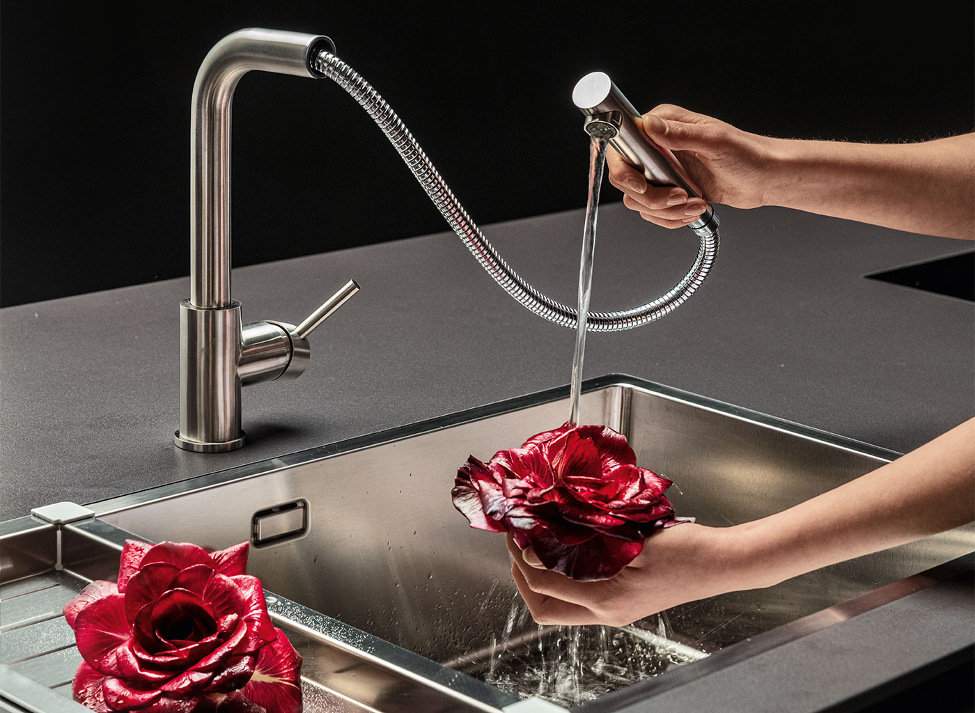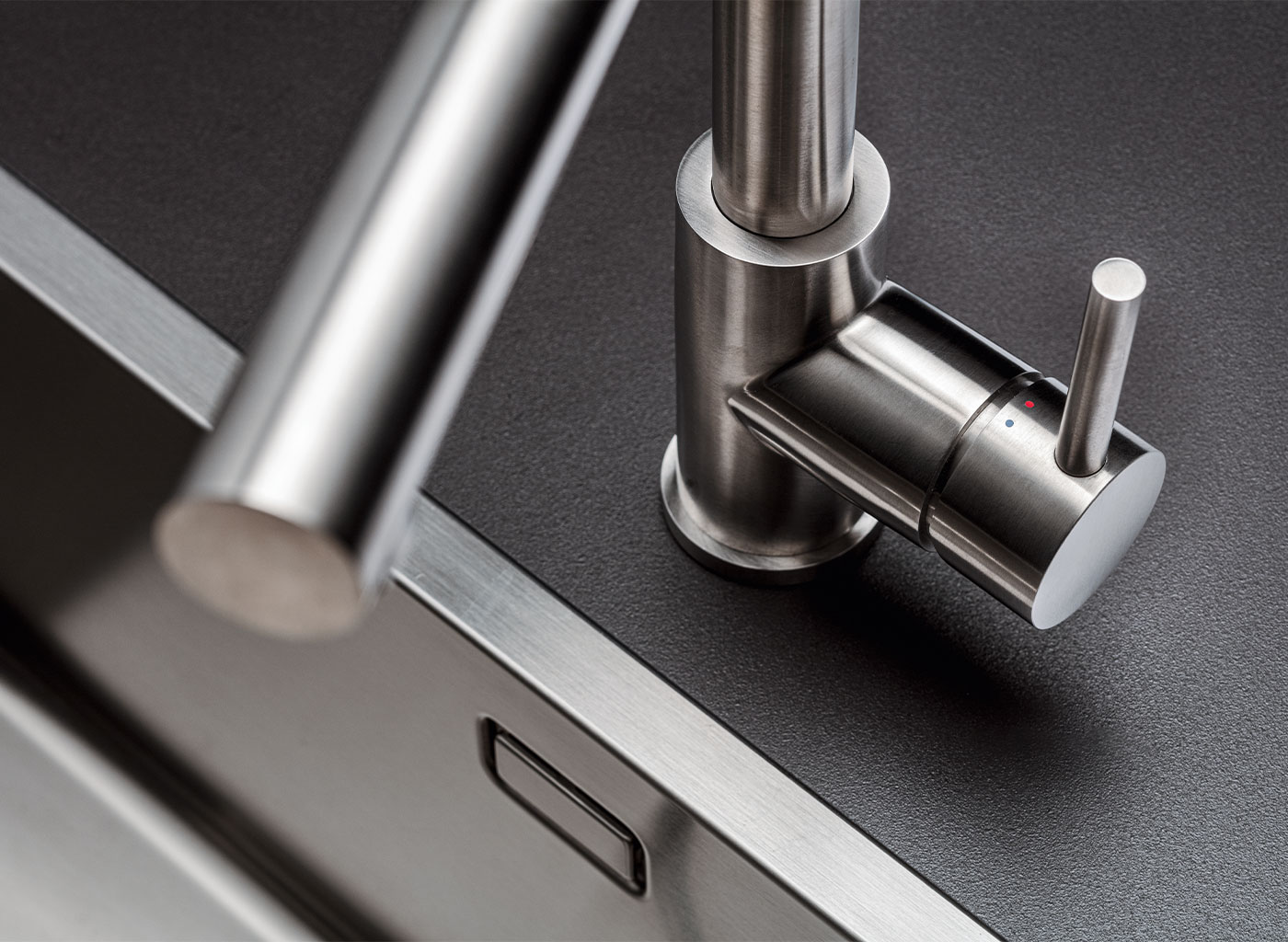 Kolekcja baterii wykonana w całości ze stali AISI 304, inspirowana koncepcją minimalistycznego designu i czystej techniki, dostosowana do codziennych potrzeb w domowej kuchni. Naturalny i całkowicie nadający się do recyklingu
