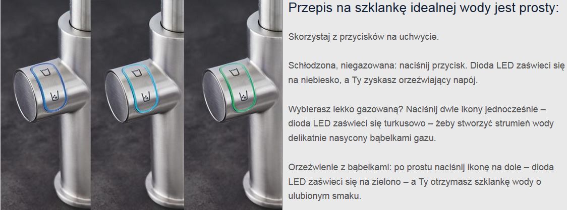 GROHE Blue Home oferuje Ci wybór między 3 wariantami wody - gazowanym, średnio gazowanym i niegazowanym. Każdemu z nich odpowiada klawisz na uchwycie, podświetlony diodami LED - wystarczy wcisnąć i przekręcić. Diody LED informują także użytkownika o zbliżającej się potrzebie wymiany filtra, zatem obsługa jest intuicyjna i jasna, nawet dla najmłodszych członków rodziny.