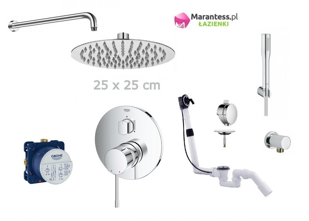 Kompletny system podtynkowy z baterią trójdrożną Grohe Essence, syfonem z wlewem wody, słuchawką oraz deszczownicą.