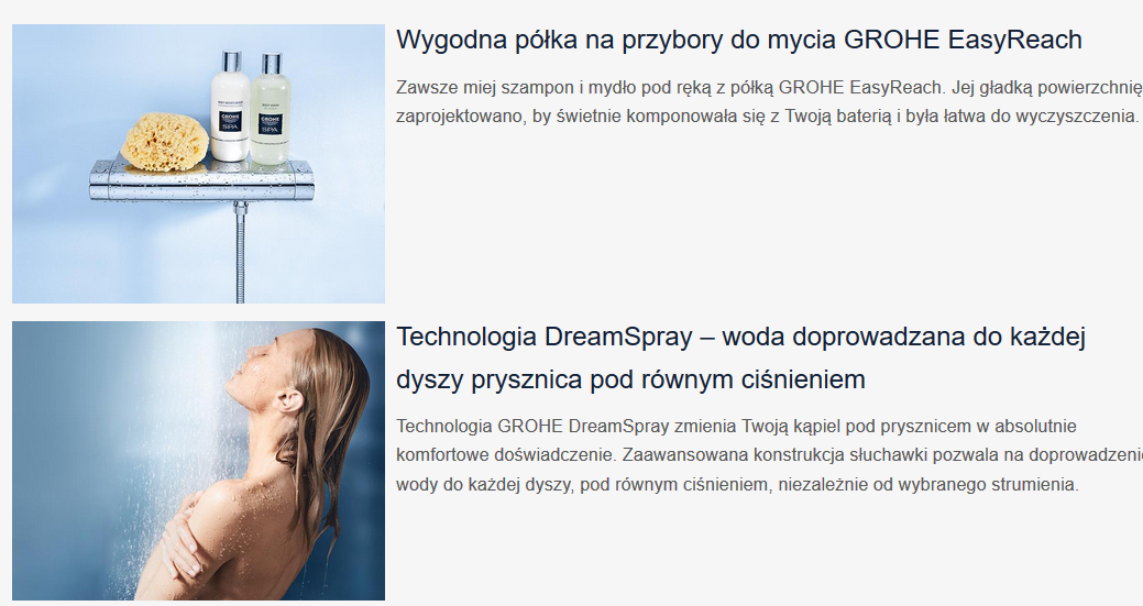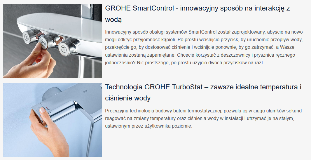 W asortymencie marki znajdziemy baterie umywalkowe i wannowe, prysznice, WC i rozwiązania sanitarne, akcesoria łazienkowe oraz ceramikę. Obok ponadczasowych i uniwersalnych systemów GROHE oferuje swoim Klientom rozwiązania doskonale dopasowane do bieżących standardów i obowiązujących trendów. W rezultacie produkty GROHE znajdują szerokie zastosowanie zarówno w przestrzeniach mieszkalnych, jak i użytkowych oraz komercyjnych. Chętnie sięgają po nie właściciele pensjonatów i hoteli, restauracji oraz salonów urody i odnowy biologicznej.