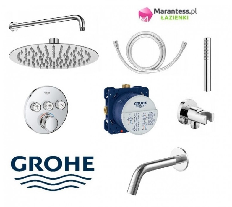 Kompletny zestaw wannowy z trójdrożną podtynkową baterią termostatyczną Grohe Grohtherm SmartControl, deszczownicą , słuchawką i wylewką podtynkową.