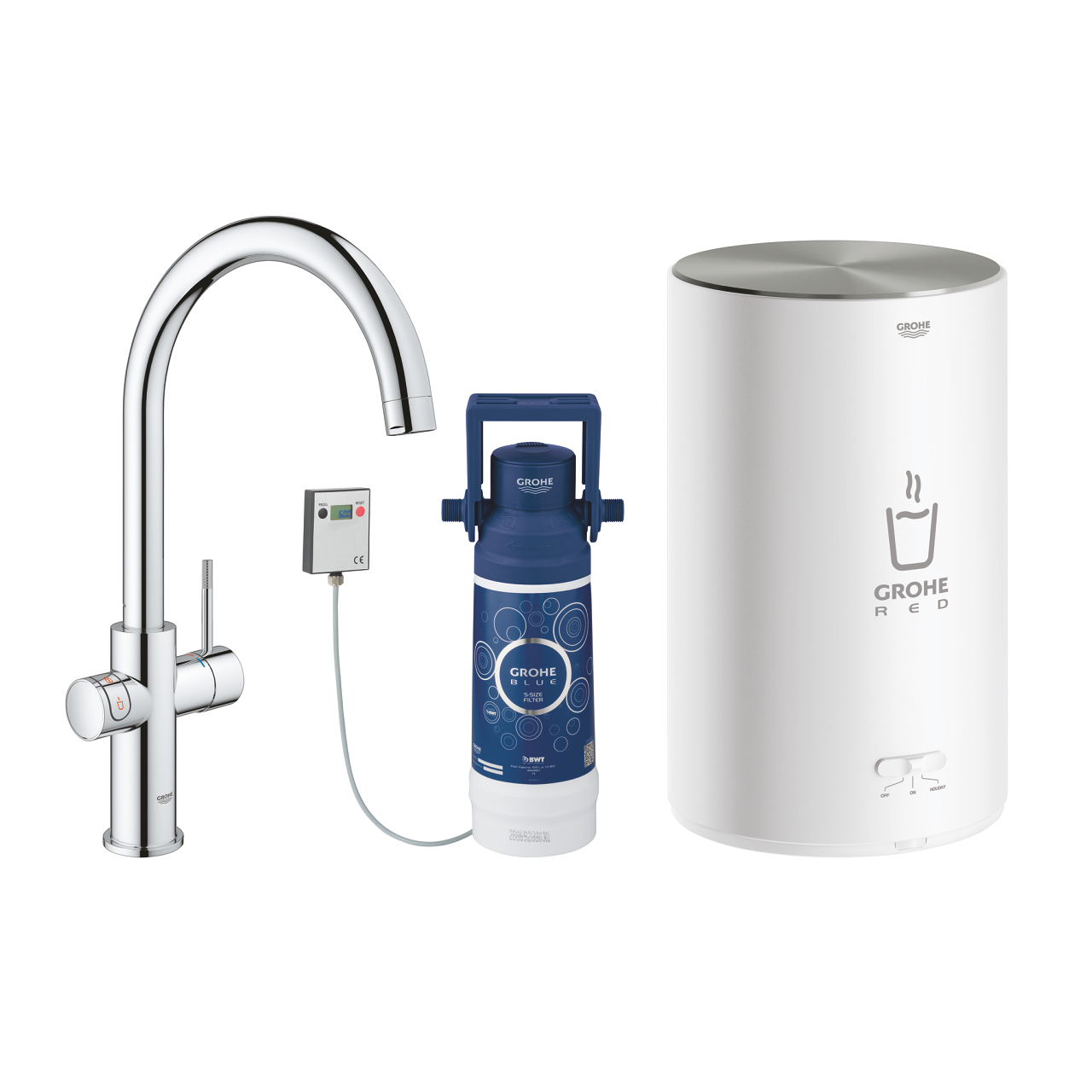 Zapomnij o czekaniu na wrzątek – niech wrzątek czeka na Ciebie! Dzięki nowoczesnemu systemowi GROHE Red, łączącemu w sobie funkcje tradycyjnej baterii zlewozmywakowej i podgrzewacza do wody, jest to możliwe! Wszystko za sprawą montowanego pod blatem bojlera, magazynującego 4 litry wody o temperaturze 100°, która doskonale nadaję się do przygotowania kawy, herbaty, makaronu czy blanszowania warzyw. Nie musisz jednak obawiać się niebezpiecznych oparzeń skóry – system wyposażono w blokadę ChildLock, uniemożliwiającą przypadkowe uruchomienie, pomagając Ci chronić Twoich najmłodszych domowników. Z podobną dbałością zaprojektowano samą baterię, wyposażoną w wysoką, obracaną w zakresie 150° wylewkę typu "C", która sprawia, że wykonywania kuchennych prac będzie prostsze, niż kiedykolwiek . W parze z funkcjonalnością idzie stylowe wykonanie, które podkreśla lśniąca, chromowana powłoka GROHE StarLight. Zachwycisz się jej nieskazitelnym wyglądem, odpornością na uszkodzenia i łatwym czyszczeniem – nawet po latach eksploatacji wystarczy przetarcie ściereczką z mikrofibry, by odzyskała blask nowości. Wprowadź swoją kuchnię w XXI wiek, montując w niej innowacyjny system GROHE Red! *Istnieje również możliwość zakupu zaworu GROHE Red 40841001, który miesza wrzątek z wodą zimną, pozwalając na uzyskanie strumienia o temperaturze w zakresie 35°- 75°C, bez konieczności instalowania dodatkowych podgrzewaczy przepływowych.