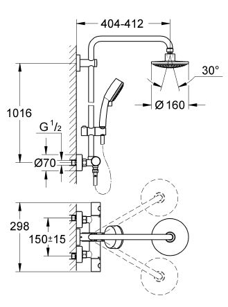 termostat natynkowy z Aquadimmerem pozwala na przełączanie pomiędzy:prysznic górny Euphoria (28 232 000) z przegubem kulowym kąt obrotu ± 15° a prysznic ręczny Duo (27 571 000)