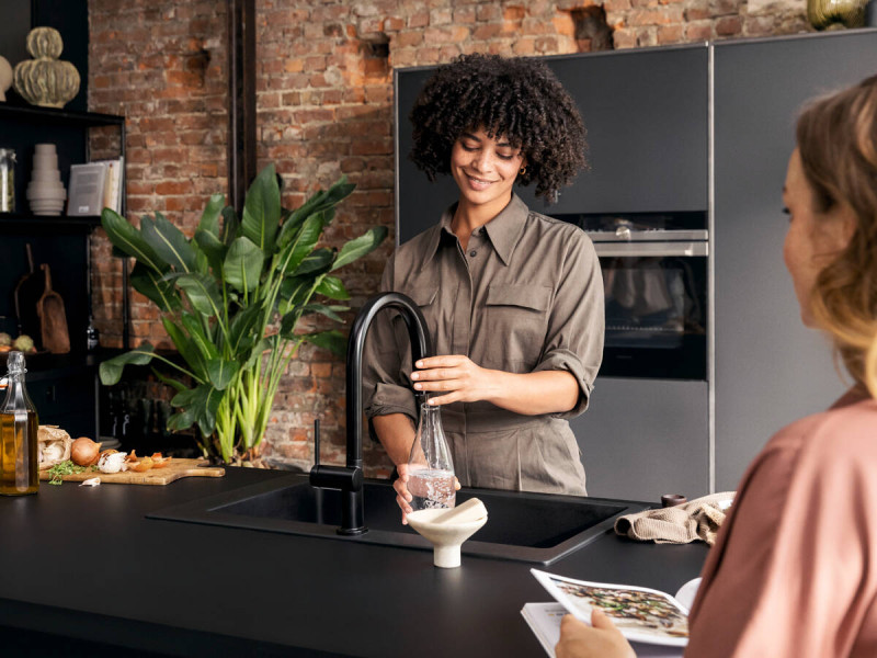Nie zawsze w strefie zlewozmywaka potrzebna jest przefiltrowana woda. Za pomocą funkcji Push możesz wybrać przefiltrowaną i/lub mineralizowaną wodę bezpośrednio na wylewce baterii. Aqittura M91 FilterSystem posiada dwa odseparowane od siebie kanały dla zwykłej wody i przefiltrowanej wody pitnej. <