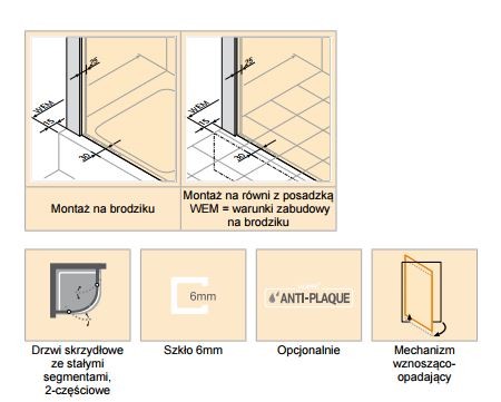 Aby skompletować narożną kabinę natryskową należy zamówić 2 sztuki drzwi. Możliwe rozwiązania asymetryczne.