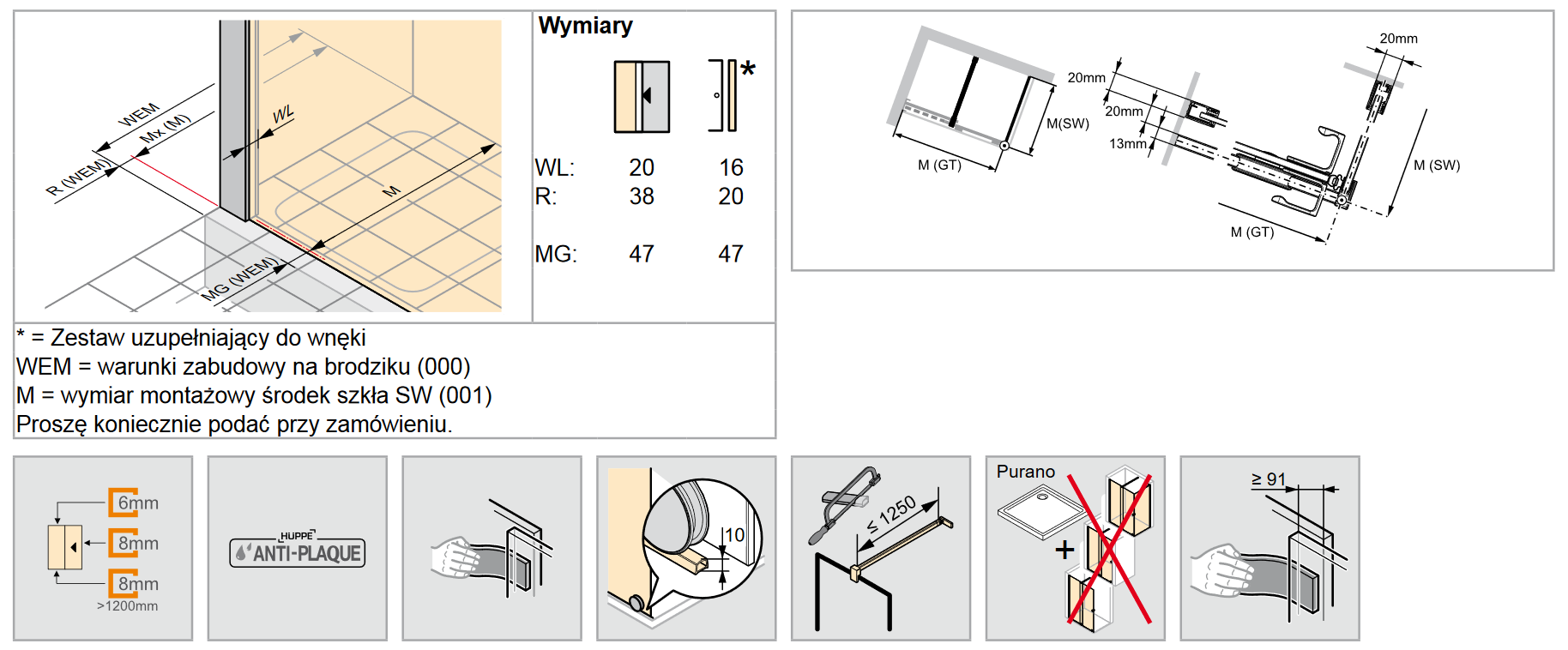 *montaż bezpośrednio na posadzce lub na brodziku. ( minimalna szerokość rantu brodzika 5 cm )
