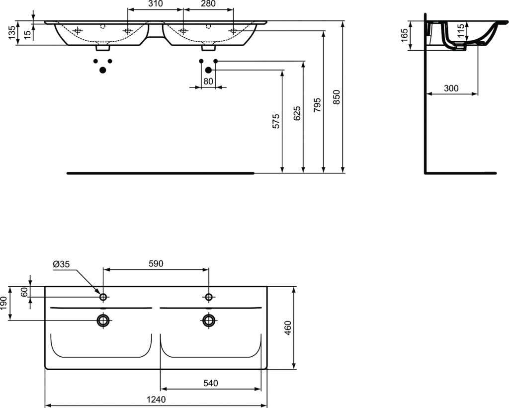 Umywalka podwójna 124 cm z powierzchniami bocznymi