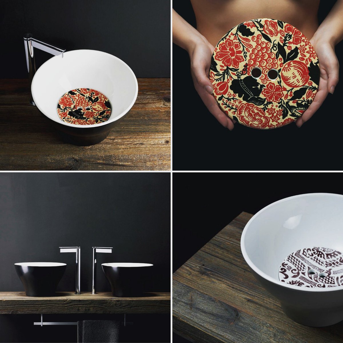 Elementem charakterystycznym są dekoracyjne pokrywy odpływu przypominające formą guzik.