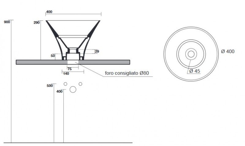 Oryginalna umywalka stawiana na blat, do kompletowania z dekoracyjną pokrywą odpływu.