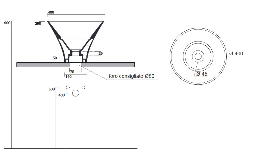 Elementem charakterystycznym są dekoracyjne pokrywy odpływu przypominające formą guzik.
