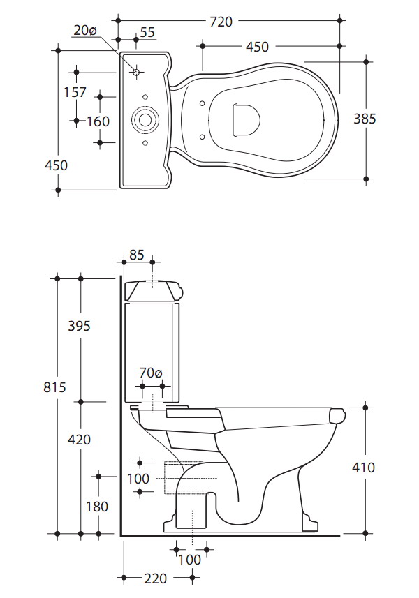Muszla stojąca kompaktowa z odpływem pionowym.