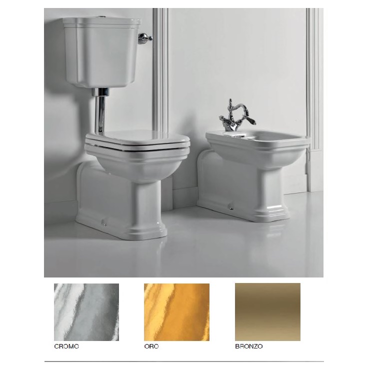 Kolekcja ceramiki dostępna w wykończeniu białym oraz czarnym. Metalowe elementy ozdobne dostępne w chromie, złocie oraz brązie.