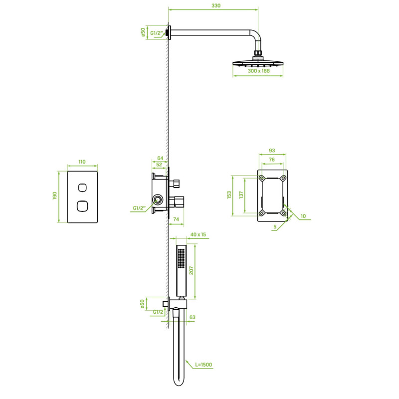 Kompletny zestaw podtynkowy z deszczownicą i słuchawką.