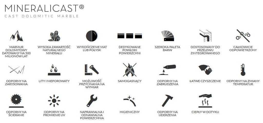 MINERALICAST® to materiał o długiej historii w firmie Marmorin i z ogromną listą zadowolonych Klientów na całym świecie. Jego głównym składnikiem jest marmur dolomitowy w postaci mączki, składającej się w 96% z Węglanu Wapniowo-Magnezowego – minerału, znanego jako “dolomit” – CaMg (CO3)2. Mączka otrzymywana jest przez rozkruszanie i oczyszczenie marmuru dolomitowego, będącego skałą metamorficzną wytworzoną przez naturalną transformację (metamorfizm), której wiek określa się na ponad 500 mln lat.Podczas procesu produkcyjnego, sproszkowany marmur dolomitowy jest łączony ze specjalnie dedykowaną żywicą, tworząc wytrzymałą masę wypełniającą. Zewnętrzna powierzchnia odlanego produktu pokryta jest jednym z naszych unikalnych żelkotów sanitarnych, zapewniającym doskonałą jakość i trwałość powierzchni. Oba związki tworzą razem unikalny materiał kompozytowy – MINERALICAST®. Jego chemiczne i fizyczne właściwości pozwalają wytwarzać wysokiej jakości produkty o niemal nieograniczonych kształtach i cechach techniczno-funkcjonalnych.