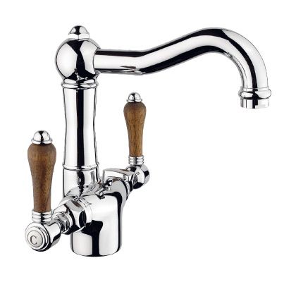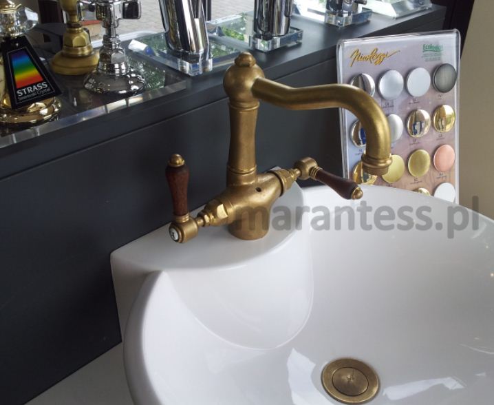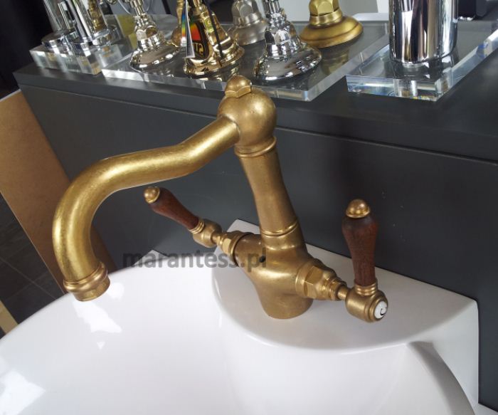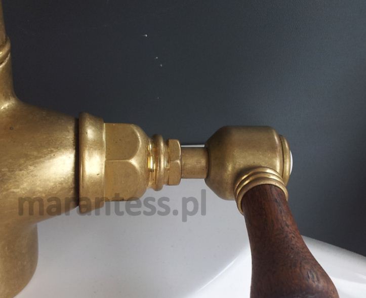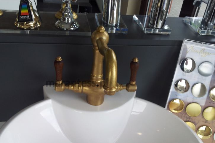 Na naszej ekspozycji znajduje się bateria w kolorze OG - stare złoto z wykończeniem drewnianym. Bateria posiada w komplecie korek automatyczny z cięgłem oraz miedziane rurki przyłączeniowe.