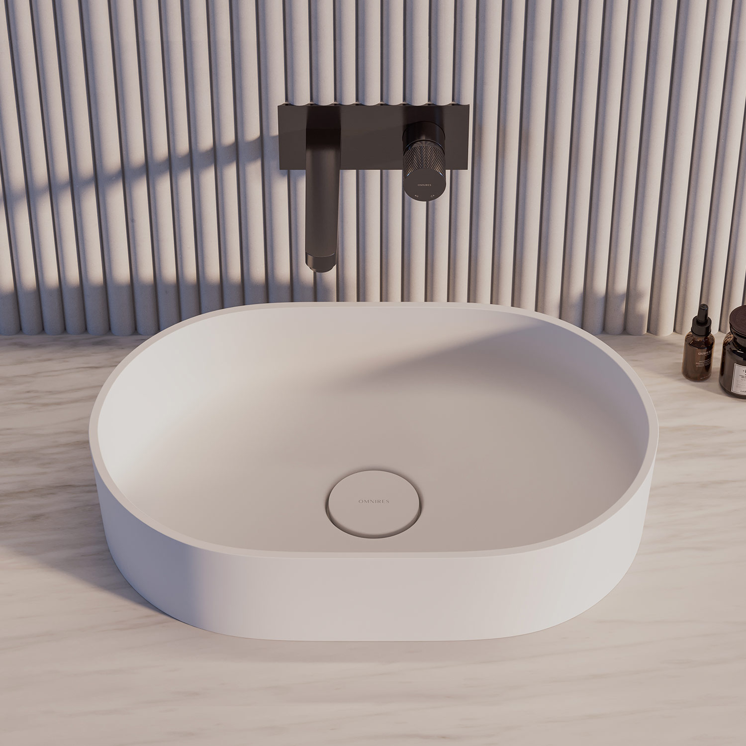 Umywalka nablatowa z kolekcji OMNIRES OVO charakteryzuje się minimalistyczną wyrazistą formą o doskonałych proporcjach. Powstały z zabawy geometrią kształt tworzą dwa przeciwległe półokręgi. Harmonijnie wyprofilowane ścianki bryły zostały wykończone płaskim, podkreślającym formę rantem. Wewnątrz umywalki, idealnie dopasowana maskownica odpływu gwarantuje najwyższą estetykę. Projekt: Paulina Shacalis, OMNIRES Studio.