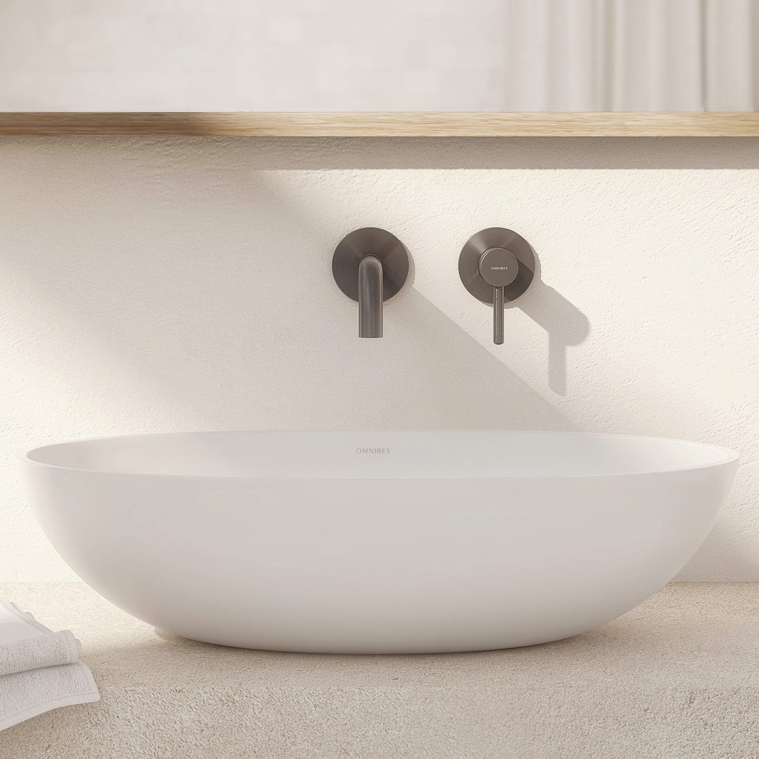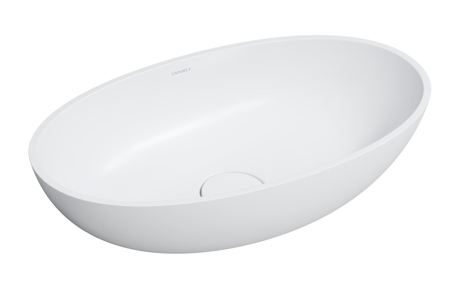 Umywalka nablatowa z kolekcji OMNIRES SHELL M+ charakteryzuje się współczesną eliptyczną formą, która miękką linią zwęża się ku podstawie. Minimalistyczna bryła wygląda lekko a zarazem solidnie, tworząc efekt wyrzeźbionego ze skały monolitu. Wewnątrz umywalki dopasowana maskownica dyskretnie zakrywa odpływ, nie zaburzając przy tym harmonijnie wyprofilowanej sylwetki. Projekt został stworzony przez studio Pawlak&Stawarski we współpracy z OMNIRES.