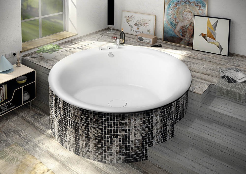 Okrągła wanna OBLO charakteryzuje się elegancką, prostą konstrukcją bez anatomicznych wytłoczeń. Kształt obszaru kąpielowego jest nietypowy, spłaszczona przedłużona krawędź nad otworem przelewowym pozwala na zamontowanie baterii w wannie stojącej, przeciwległe nachylenie oparcia zapewnia wygodne siedzenia.