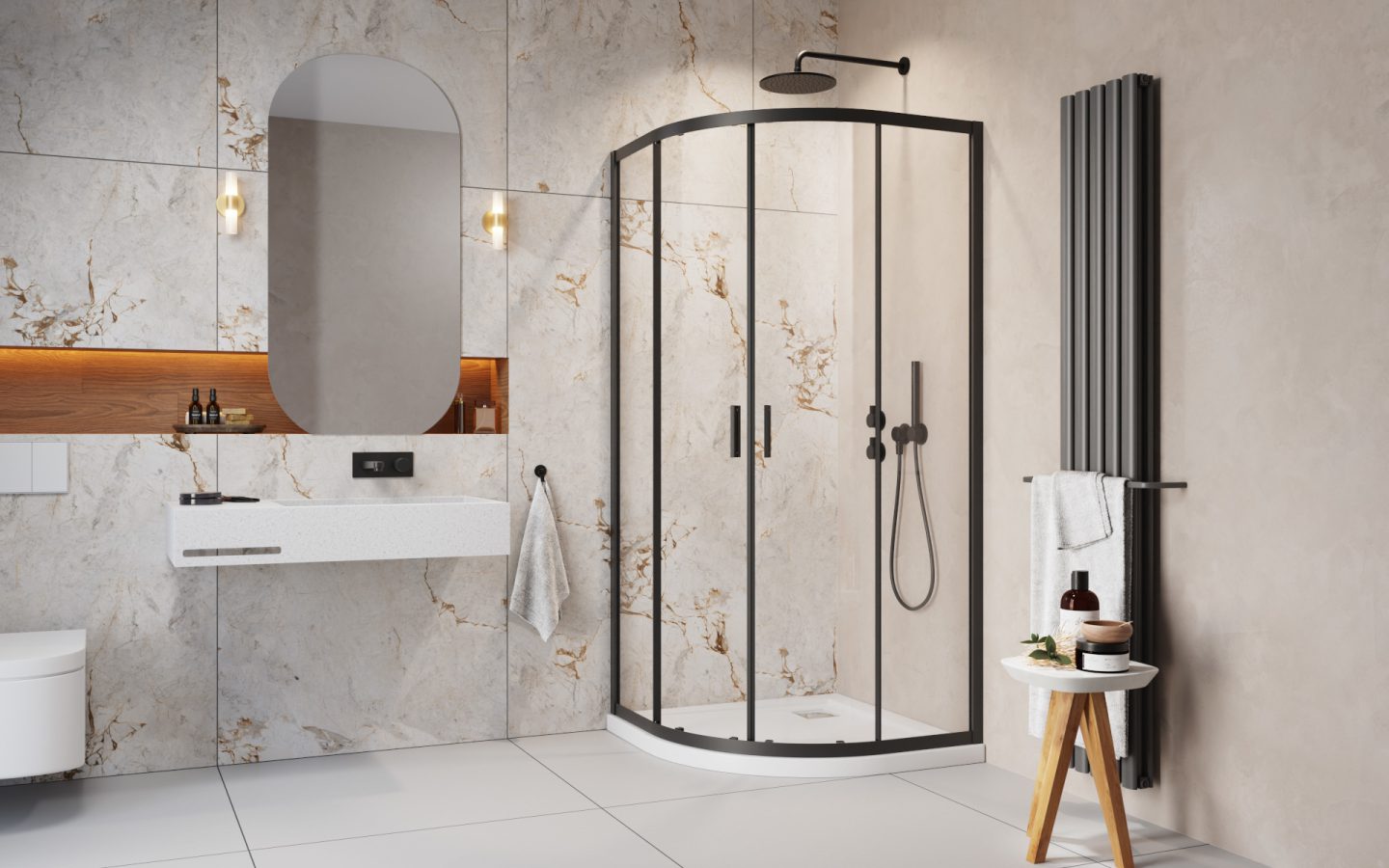 Seria kabin Alienta Black charakteryzuje się uniwersalną konstrukcją i funkcjonalnymi rozwiązaniami technicznymi. Dzięki przesuwnemu sposobowi otwierania drzwi, idealnie nadaje się do przestrzeni łazienkowych z ograniczoną powierzchnią. Jej czarne profile, uchwyty oraz uszczelki nadają wnętrzu łazienki wyjątkowego charakteru i stylu.