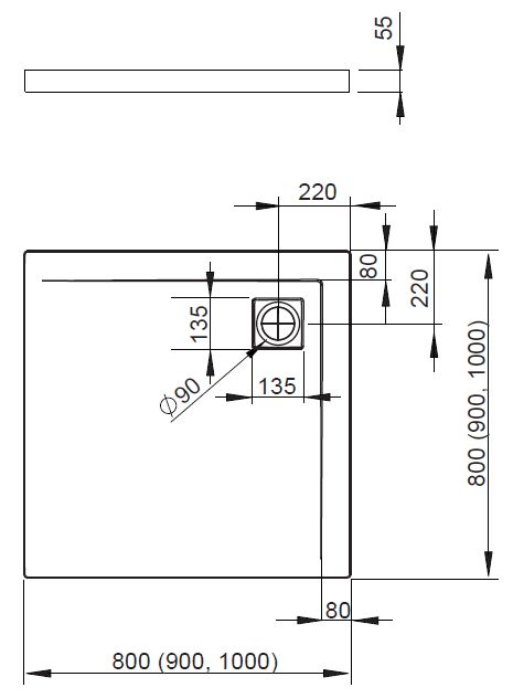 Płytki brodzik kwadratowy z otworem na syfon o średnicy 90 mm,przeznaczony do montażu bezpośrednio na podłodze, zalecany syfon z kwadratową pokrywą R399.
