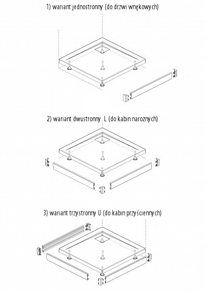 3. wariant trzystronny U (do kabin przyściennych) - brodzik z nóżkami, 3 panele w odpowiednich długościach i kolorach, 2 zakończenia i 2 narożniki w odpowiednich kolorach