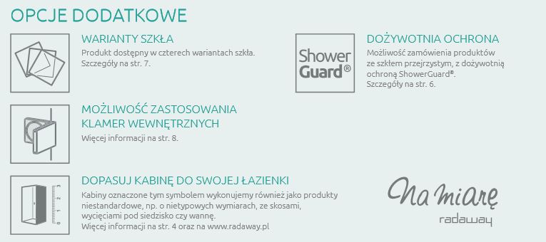 Marka Radaway to znany i ceniony producent wysokiej jakości komfortowych kabin prysznicowych odznaczających się ciekawym wzornictwem oraz precyzją wykonania. Marka jest obecna na rynku nieprzerwanie od 2002 roku, stale poszerzając swój asortyment o rozwiązania podnoszące funkcjonalność kabin prysznicowych i natryskowych. Wieloletnie doświadczenie marki sprawia, że Radaway doskonale wpisuje się w potrzeby i oczekiwania Klientów urządzających łazienki.