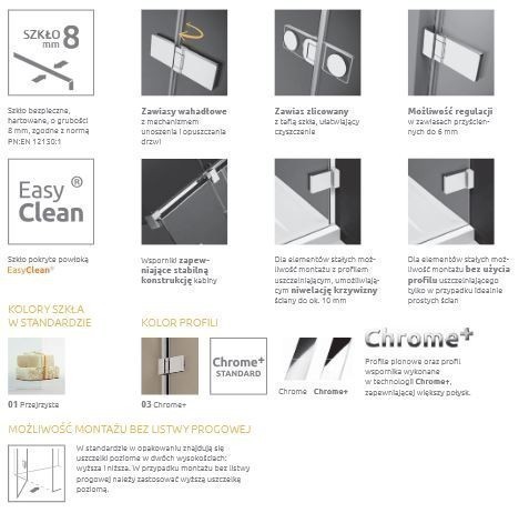 • Eleganckie detale – wykonane w standardzie w technologii Chrome+ charakteryzującej się większym połyskiem i pozwalającej na lepsze dopasowanie kabin do baterii łazienkowych
