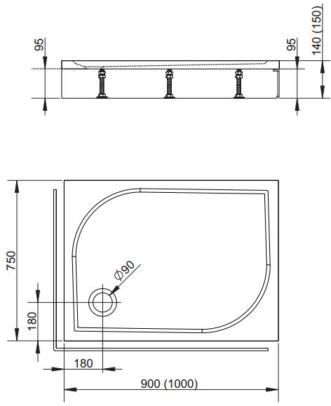 Płytki brodzik ze zdejmowana budową z otworem na syfon o średnicy 90 mm.