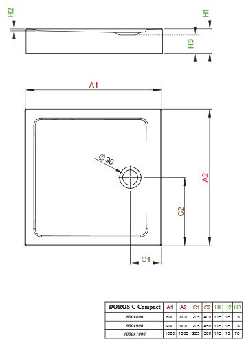 Kwadratowy brodzik akrylowy przeznaczony do montażu bezpośrednio na podłodze, z otworem na syfon o średnicy 90mm.