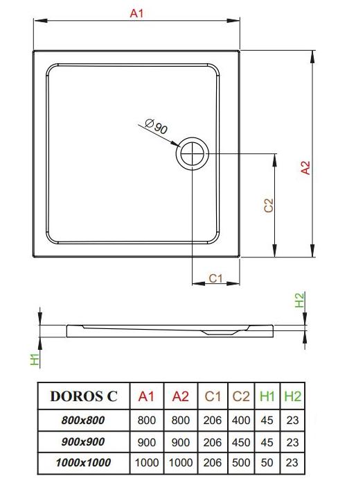 Kwadratowy brodzik akrylowy z wypełnieniem poliuretanowym przeznaczony do montażu bezpośrednio na podłodze, z otworem na syfon o średnicy 90mm.