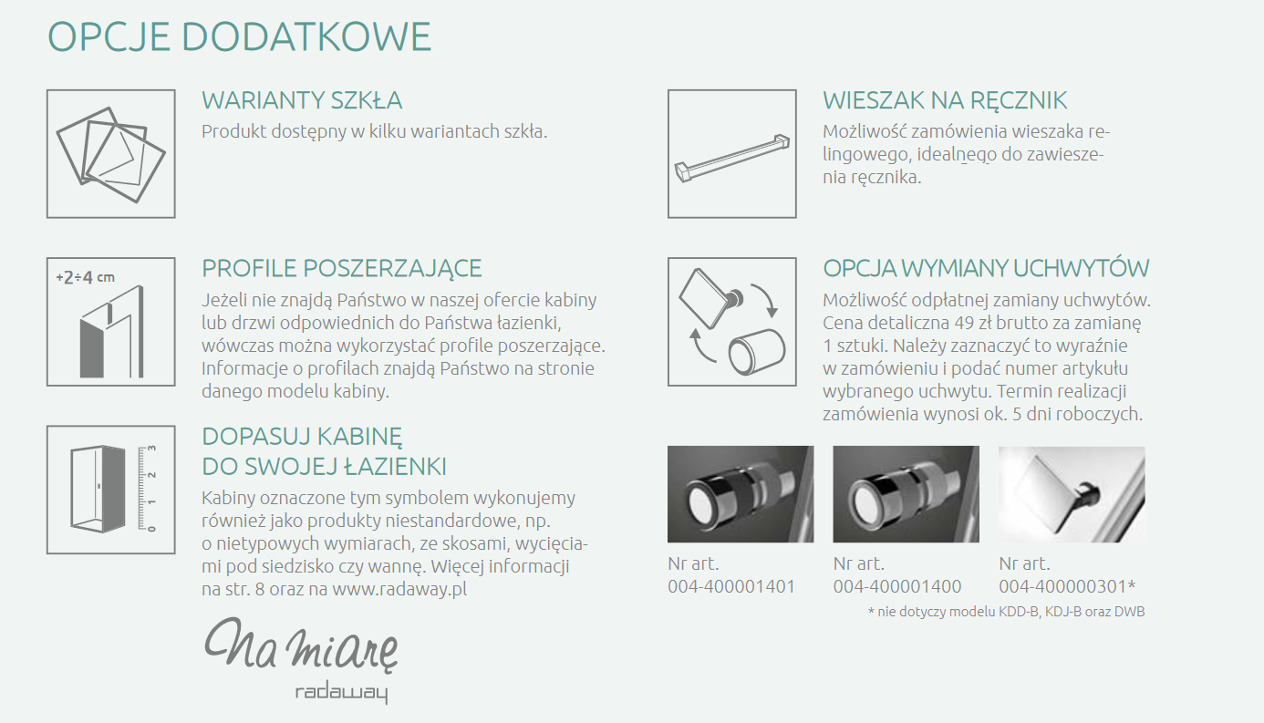 Klientów poszukującej ciekawej stylistyki, wysokiej jakości oraz komfortu użytkowania zapraszamy do zapoznania się z naszą ofertą na prysznice Radaway i akcesoria. W asortymencie posiadamy szeroki wybór rozwiązań odznaczających się doskonałymi walorami estetycznymi i funkcjonalnymi. Kabiny Radaway oferujemy w szerokiej palecie kolorystycznej, także w najmodniejszych w ostatnich sezonach kolorach czarnym i złotym.
