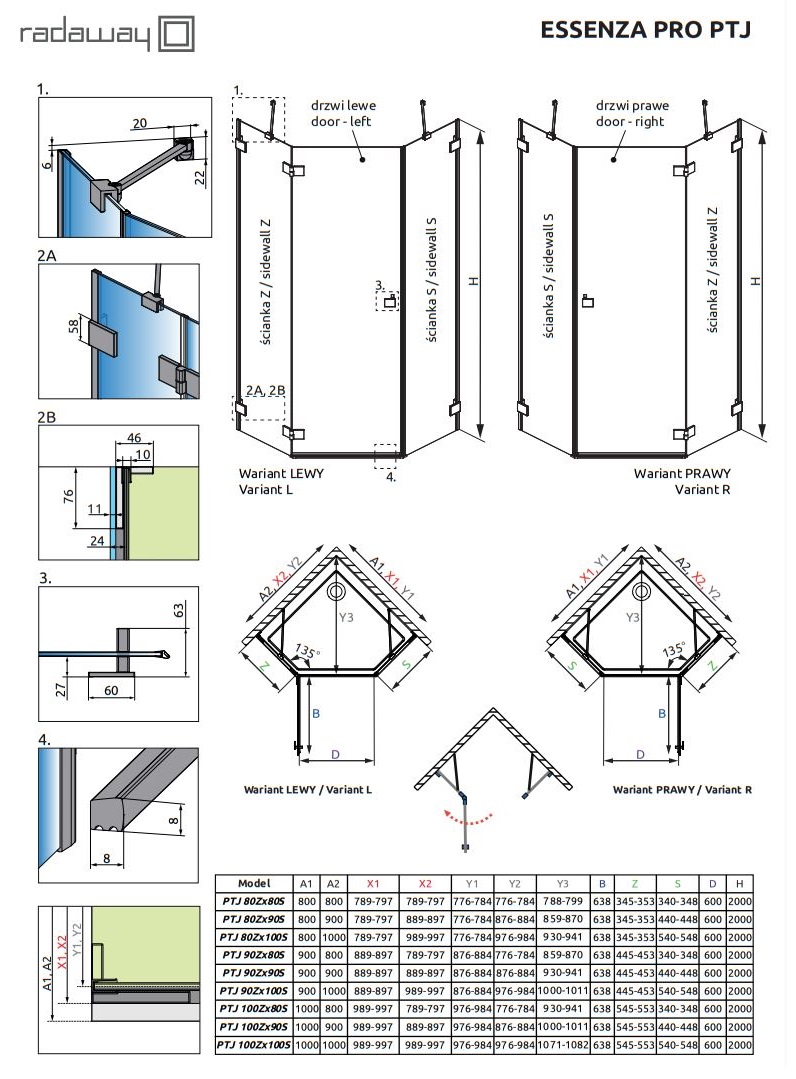 Kabina pentagonalna PTJ 80x80 drzwi lewe