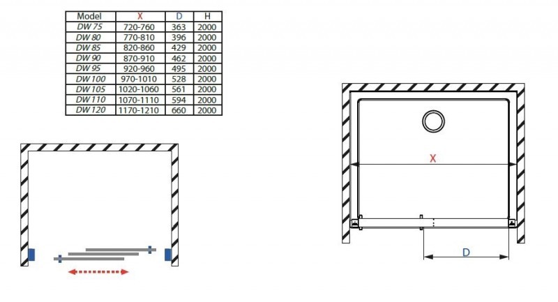 Szeroki wachlarz rozmiarów oraz zastosowanie drzwi składających się z trzech przesuwnych tafli szkła umożliwia uzyskanie stosunkowo szerokiego wejścia do kabiny prysznicowej nawet przy małych rozmiarach wnęki (o szerokości 75-90 cm).