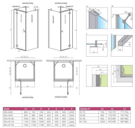 Kompletna kabina składa się z drzwi kabiny oraz dwóch ścianek bocznych.