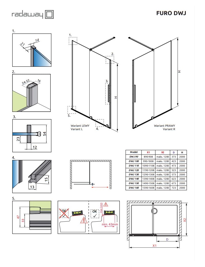 WAŻNE! Standardowo kabiny dopasowane są do montażu na brodziku o określonych wymiarach i właśnie te wymiary są podane w nazwie kabiny lub jej części. Rzeczywiste wymiary gabarytowe kabiny są nieco mniejsze od nominalnych podanych w nazwie artykułu. Jeśli planujesz montaż kabiny bezpośrednio na posadzce, zwróć uwagę na wymiary gabarytowe (X1, X2) oraz wymiary do osi szyby (Y1, Y2), które podane są na rysunku technicznym.