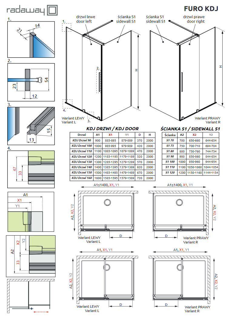 Uwaga! Wymiar kabiny dopasowany jest do montażu na brodziku o standardowym rozmiarze. W rzeczywistości kabina jest mniejsza. Jeśli planujesz montaż kabiny bezpośrednio na posadzce, zwróć uwagę na wymiary do osi szyby (Y1, Y2), które podane są w karcie katalogowej.
