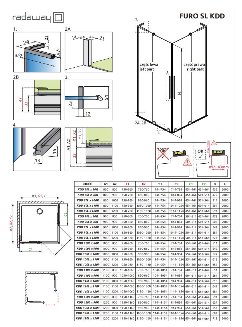 Uwaga! Wymiar kabiny dopasowany jest do montażu na brodziku o standardowym rozmiarze. W rzeczywistości kabina jest mniejsza. Jeśli planujesz montaż kabiny bezpośrednio na posadzce, zwróć uwagę na wymiary do osi szyby (Y1, Y2), które podane są w karcie katalogowej.