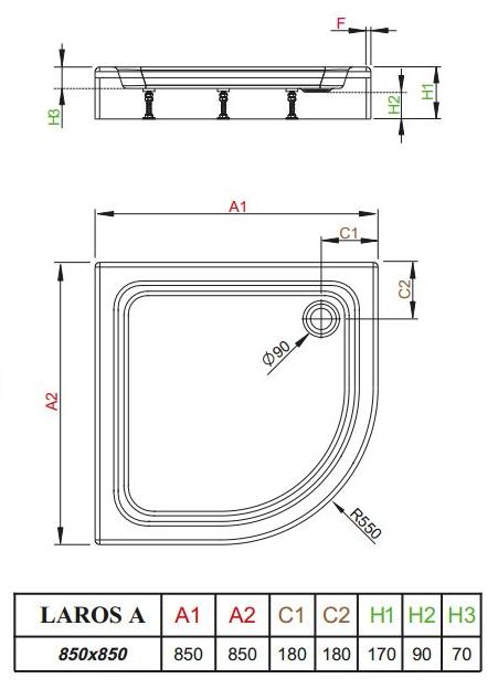 Półokragły brodzik ze zintegrowaną obudową, nóżki w komplecie, otwór na syfon Ø90mm, zalecane syfony TB90P, 690P.